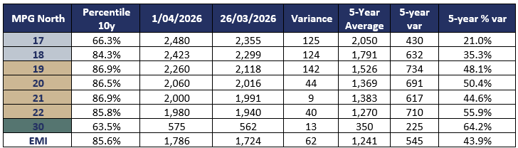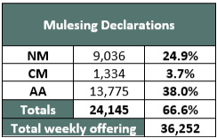 Competition came from a wide range of buyers, with a few companies returning to the top of the list after a brief hiatus from the top four. Exporters have felt increasing pressure on their credit facilities due to the 40% increase in costs year on year, and whilst wool production is down, the volume of wool being offered from previous seasons is keeping the numbers within 3.5% of the previous season.