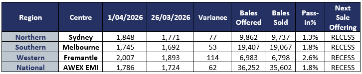 The AWEX EMI closed the week at 1724c, down 27c at auction sales this week. Foreign exchange opened the week with the AUD trading as high as 70.5 USc, which contributed to the EMI falling by 44c in USD terms. From the 39,673 bales offered, the clearance rate was predictably slightly above average at 91.1%, as sellers exercised their right.