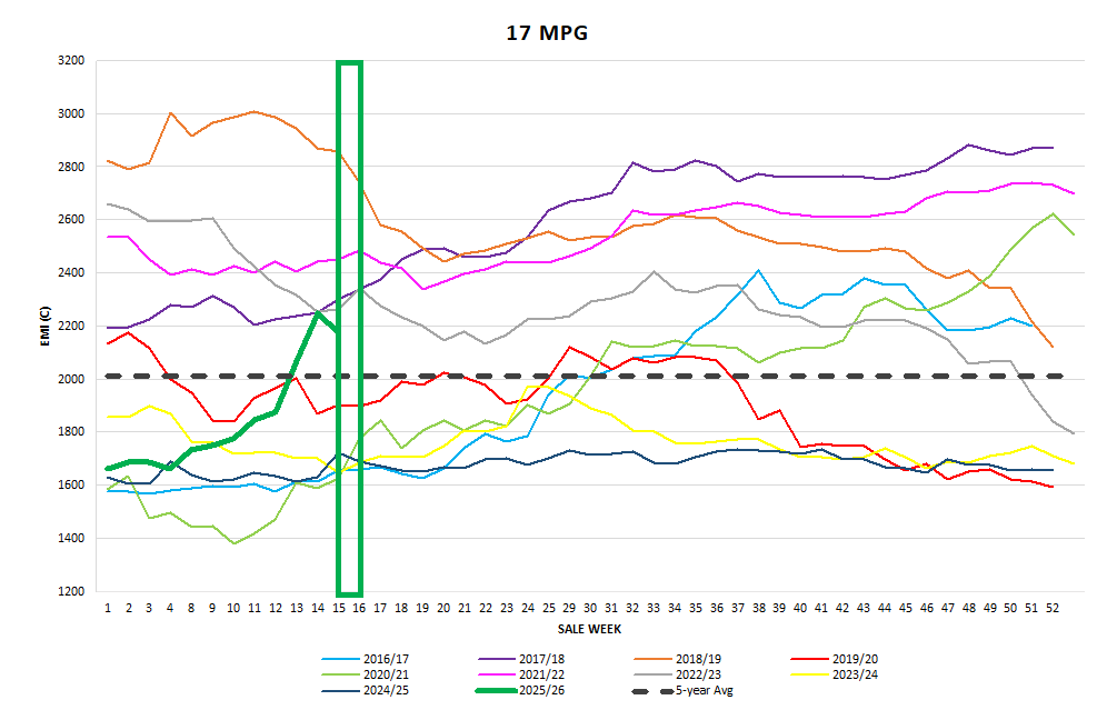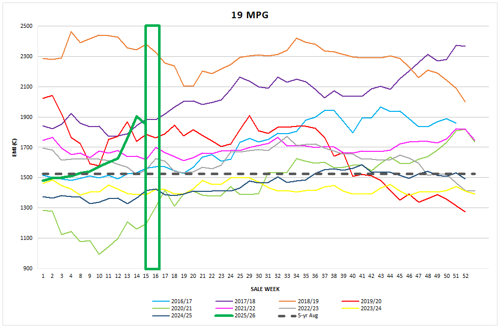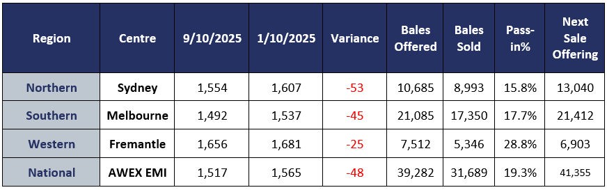 Week S15: 9/10/2025: The AWEX EMI closed the week on 1517c, down 48c at auction sales in Australia this week. Whilst this week was a less than pleasing result, especially when signals an abrupt halt to a record breaking 11-straight weekly, 358c rise in the EMI. It is a constant reminder that “in markets, feelings trade first, facts settle later.” In the past three-week sales, the previous weekly gains have quadrupled that of this week’s retraction. This week the offering crept up towards the 40,000-bale barrier with 39,282 bales being presented for sale. Whilst the lower price basis was somewhat expected, the caution demonstrated in the sale rooms saw only 80.7% of the offering being transacted as sellers showed resistance to the prices on offer. Whilst this was the highest pass in rate for some time, it reflects the impact of price volatility and uncertainty when the wool market is at such a pivotal point in time. Competition came from a combination of local Trading Exporters and Chinese indent operators and China’s Early-stage processors.