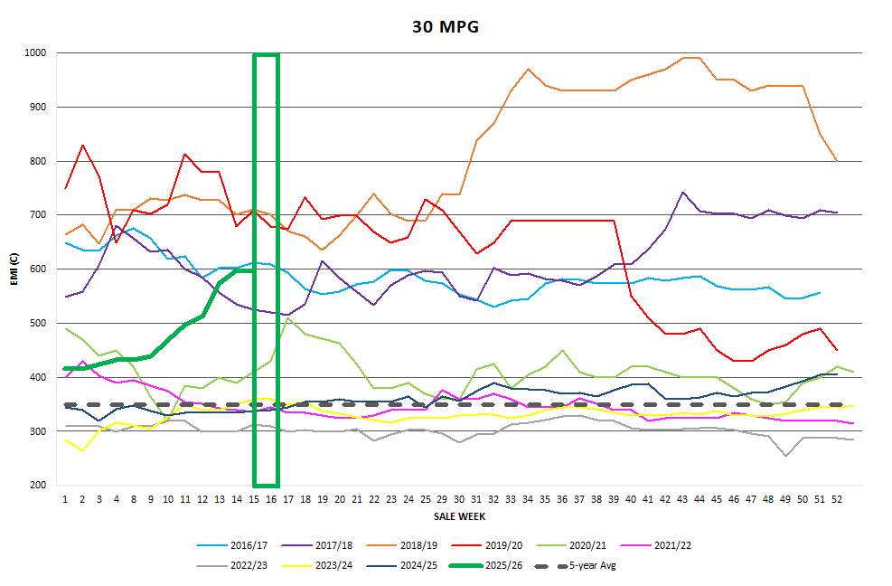 copped the full force of the price adjustments with the 16.5 MPG falling 102c whilst the 18.5-17 MPG’s falling 72-92c with the 19-22 MPG’s back 42-55c. 60.5% of the fleece offering was purchased by the top 4 buyers.