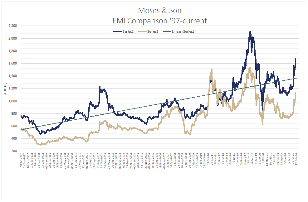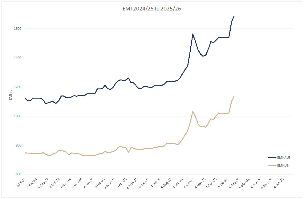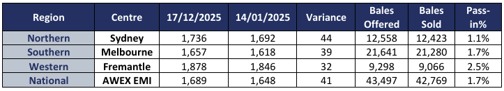The AWEX EMI continued its 2026 upward trend, closing the week on 1689c, up 41c at auction sales in Australia this week. Facing potential challenges of increased weekly quantity, and a stronger AUD/USD exchange rate. The market cleared 98.3% of the 43,497 bales offered, the largest national offering in 12 months to the day. The accrued rises in the EMI in the 2 selling weeks for 2026 are 148c (+9.6%) and 116 in USc (+11.4%).