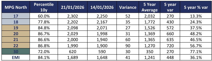 The last fortnight has been a wild ride for all of the MPG’s with 19, 20,21,28 and 30 MPG’s achieving their highest percentile rankings in 5 years. Merino Cardings moved up to the 60th percentile whilst the 17MPG has risen to the 67th percentile ranking it has risen 639c from 1663c to close on 2302c since the opening sale.