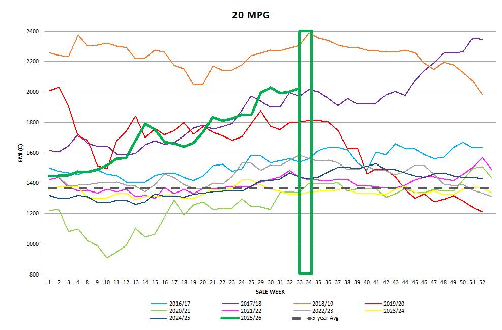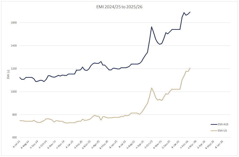 The AWEX EMI closed the on 1693c, up 16c at auction sales in Australia this week. 37,301 bales were offered Sydney Melbourne and Fremantle with a 94.9% clearance rate. With the AUD inching up this week’s EMI increased by a very solid 27c to close on 1205c the highest EMI in US currency since August 2019 as the AUD crept up to 71.15c during the sale days.