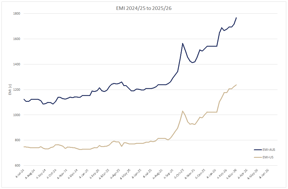 The EMI closed on 1767c up 51c at auction sales in Australia this week. After last week’s larger than normal offering this week’s national offering reverted back to 37,212 bales. 97.9% of the offering cleared to the trade with the EMI posting a 26 c rise on Tuesday and Wednesday saw the EMI followed through, with a 25c rise in the EMI. Whilst the large trading exporters dominated the market early in the week, aggressive participation from Indent Exporters provided the competitive tension needed to keep the market positive throughout the week.