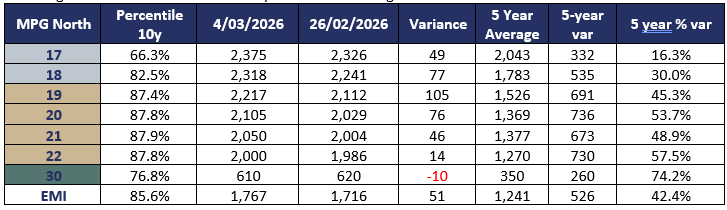 Opened the week strongly with the Northern Region offering a good selection of FNF lots with length between 100-120mm. Prices rose up to 13c for the 26 MPG and the best specified lots with all other MPG’s ranging from firm to 3c dearer. The market was cheaper on Wednesday with reports of a degradation in the style and specification of the offering in the eastern centres. Prices fell up to 20c on the 26-28 MPG’s whilst all others held generally firm.