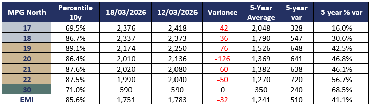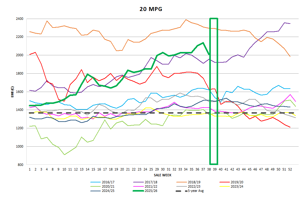 The EMI fell 22c on Tuesday and another 10c on Wednesday and was the largest weekly fall since October 2025. All the individual MPG’s fell over both selling days in all three centres, with just one exception, the Merino Carding indicator. Fine oddments remained fully firm or was slightly dearer in the Eastern Selling Centres whilst Fremantle MC fell 45c for the week.