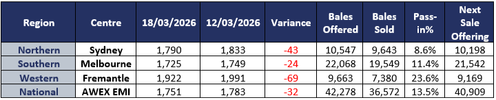 The AWEX EMI closed the week on 1751c down 32c at auction sales in Australia, whist in USD terms it fell 27c to 1246c. 42,278 bales were offered this week, with only an 86.5% clearance rate measured, the highest pass in rate for some time. After experiencing a long run of price increases since the start of 2026, this week it took a 32 fall.