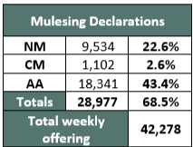 experienced an initial pull back of buyer interest in the average style High VM clips, with “good” style medium types and high VM taking a price hit on both days, noting the headline losses being in the northern centres for 19µ and broader merino types. Whilst we endured a split roster last week due to the Melbourne labour day holiday, there was some catch from the other centres to factor in on Tuesday. Competition came from the Large Australian Exporters and Chinese indent operators and China’s largest Top maker.