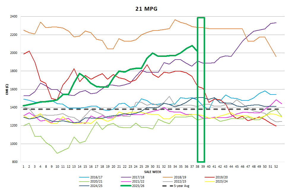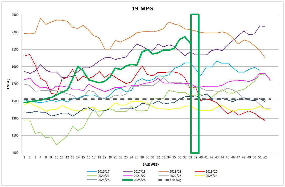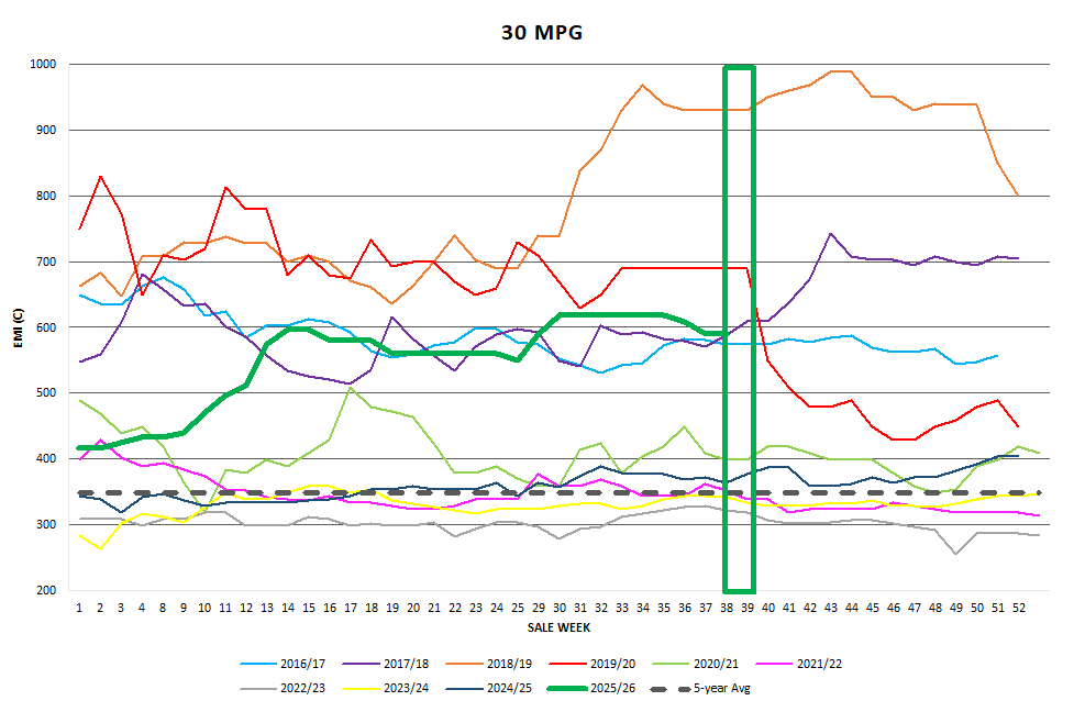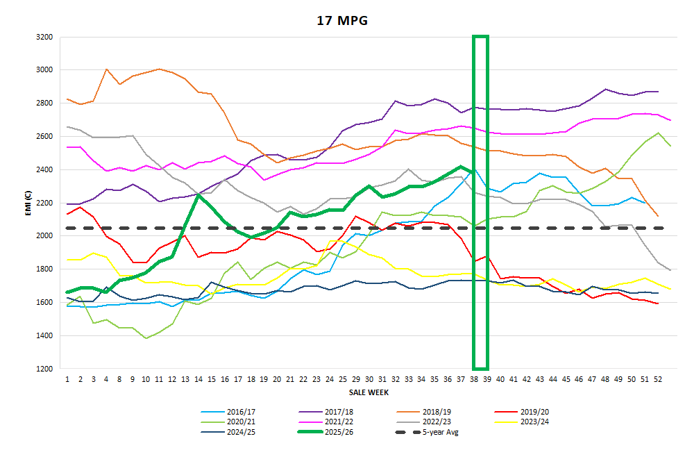 have had a rough week with heavy price falls recorded in the increased quantity of poorly prepared lots. The best style and well-prepared lots fell 10-15c over the week.
