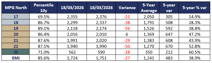 Opened on a weaker note, with the northern selection of low tensile strength fleece dragging the market down. Despite this, the northern market cleared 96% of the offering, whilst the south and west passed in 6.1% and 14.5% respectively. Wednesday’s selection was slightly better in style and measurement, which in turn attracted spirited bidding and better prices. Despite this, the MPGs indicated a slightly weaker end of day result. Competition came from Chinese indent operators, the large Australian trading exporters, and large Chinese top makers.