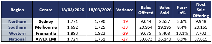 The AWEX EMI closed the week at 1724c, down 27c at auction sales this week. Foreign exchange opened the week with the AUD trading as high as 70.5 USc, which contributed to the EMI falling by 44c in USD terms. From the 39,673 bales offered, the clearance rate was predictably slightly above average at 91.1%, as sellers exercised their right.
