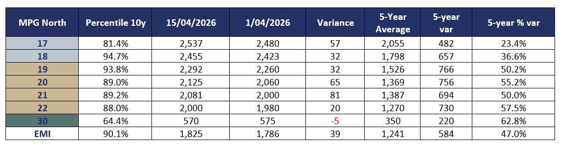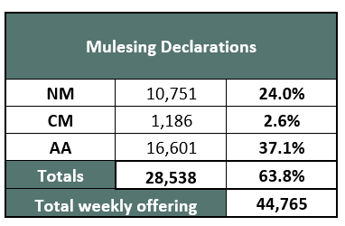 Working against and appreciating foreign exchange where the AUD increased 2.24% against the USD with the EMI closing on 1302 USC an increase of 68 USc for the week. All centres were operating with slightly elevated quantities after the 1-week Easter holiday recess.